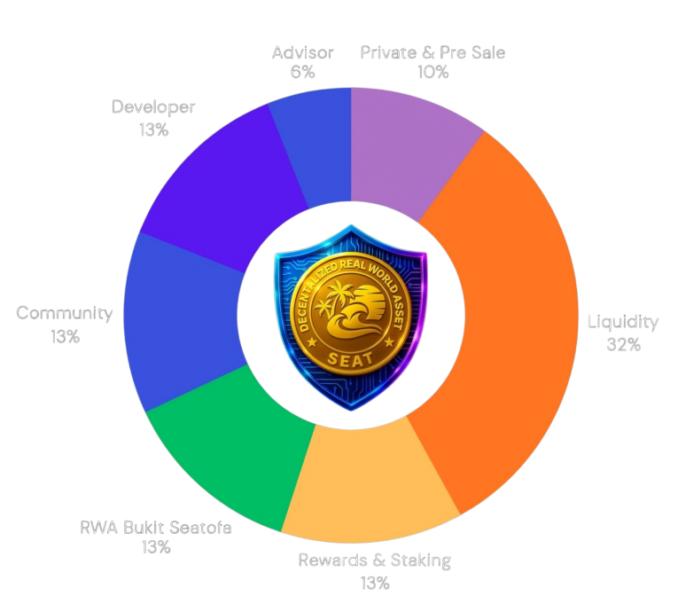Dari total suplai 7.777.777 SEAT, token dialokasikan ke beberapa sektor strategis untuk mendukung arah dan tujuan pengembangan ekosistem sesuai dengan roadmap Seatofa Token (RWA Ecosystem). Setiap alokasi dirancang secara proporsional guna memastikan pertumbuhan berkelanjutan, stabilitas nilai, serta manfaat jangka panjang bagi komunitas dan investor.